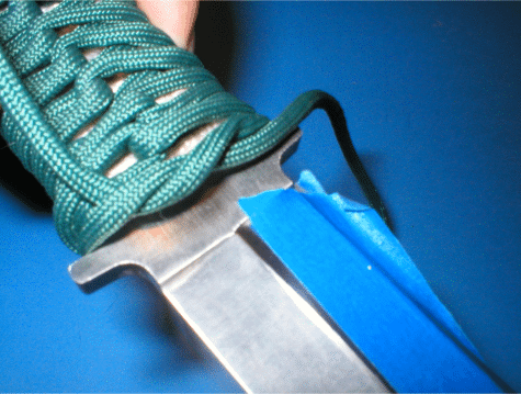 Start the second layer of wrap by looping the paracord through the back hole. This will anchor it securely. | |