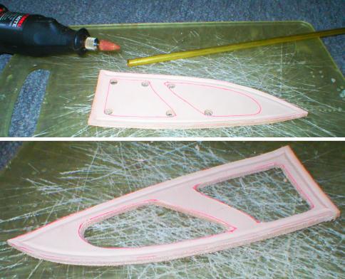 Inlay backing glued to the thin leather backing. Make sure these match up to the cutouts in the sheath front. | |